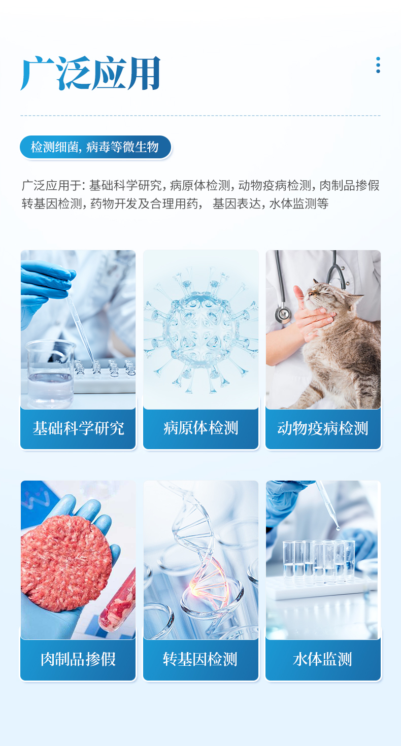 儀器采用通用100uLPCR反應(yīng)管,降低耗材成本且易于獲得。廣泛應(yīng)用于:基礎(chǔ)科學(xué)研究,病原體檢測(cè),動(dòng)物疫病檢測(cè),肉制品摻假,轉(zhuǎn)基因檢測(cè),藥物開(kāi)發(fā)及合理用藥, 基因表達(dá),水體監(jiān)測(cè)等