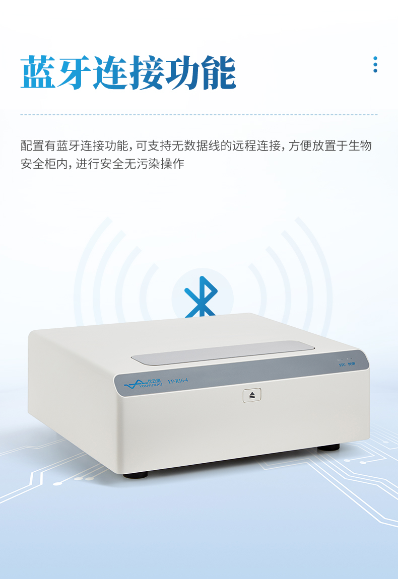 儀器配置有藍(lán)牙連接功能,可支持無(wú)數(shù)據(jù)線的遠(yuǎn)程連接,方便放置于生物安全柜內(nèi),進(jìn)行安全無(wú)污染操作。