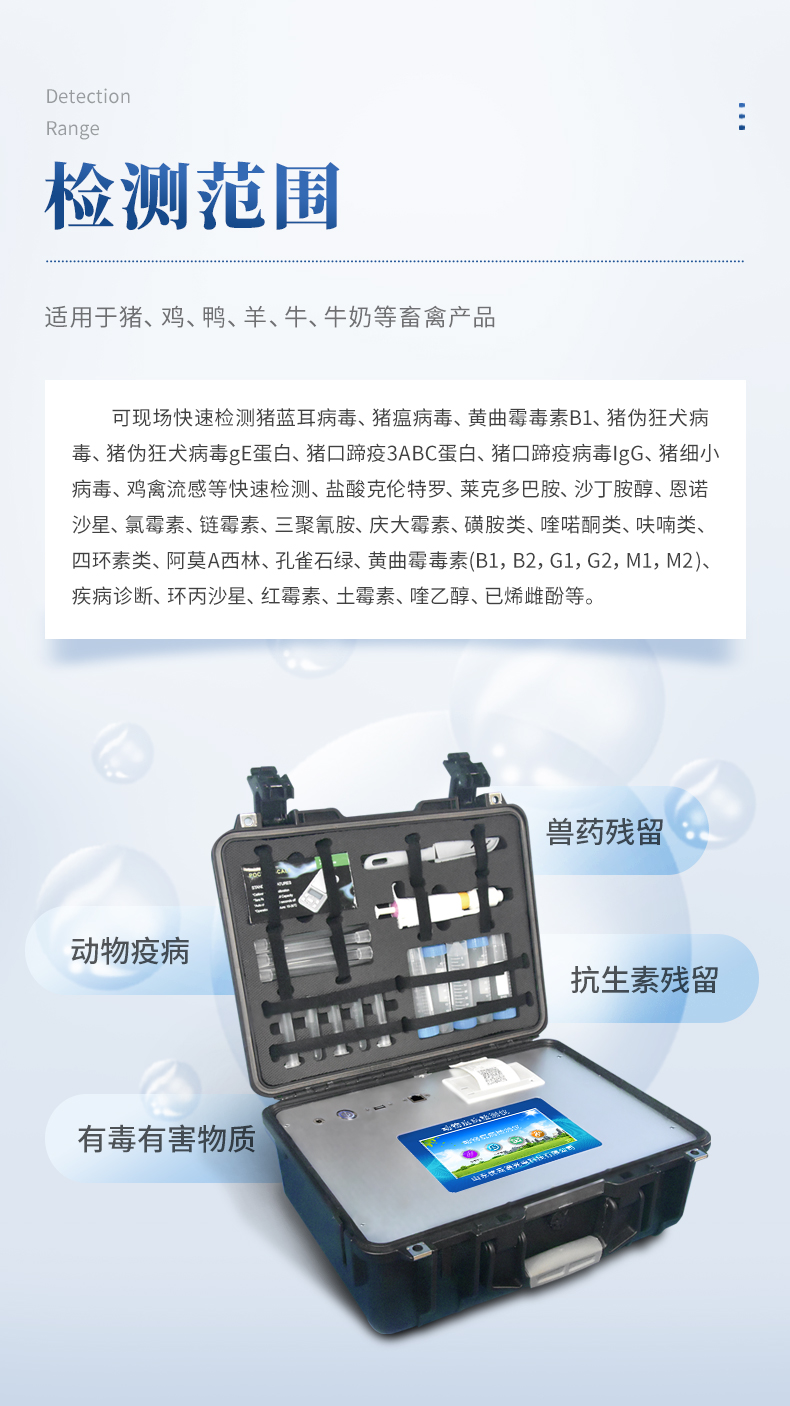 動物疫病診斷儀可現(xiàn)場快速檢測豬藍(lán)耳病毒、豬瘟病毒、黃曲霉毒素B1、豬偽狂犬病毒、豬偽狂犬病毒gE蛋白、豬口蹄疫3ABC蛋白、豬口蹄疫病毒IgG、豬細(xì)小病毒、雞禽流感等快速檢測、鹽酸克倫特羅、萊克多巴胺、沙丁胺醇、恩諾沙星、氯霉素、鏈霉素、三聚氰胺、慶大霉素、磺胺類、喹喏酮類、呋喃類、四環(huán)素類、阿莫西林、孔雀石綠、黃曲霉毒素(B1,B2,G1,G2,M1,M2 )、疾病診斷、環(huán)丙沙星、紅霉素、土霉素、喹乙醇、已烯雌酚等項(xiàng)目的定性檢測。