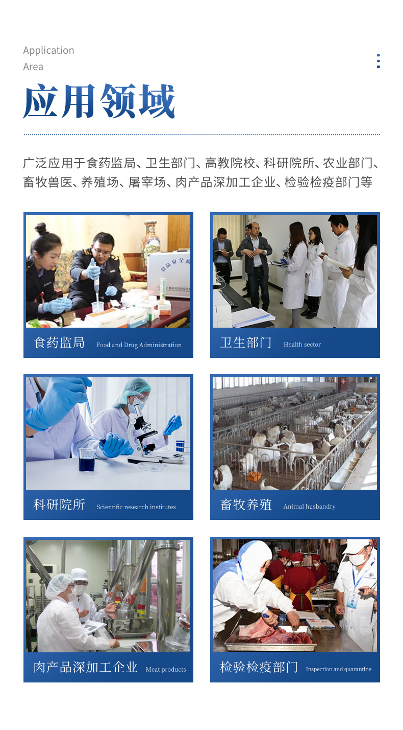 該動物疫病診斷儀適用于豬、雞、鴨、羊、牛、牛奶等畜禽產(chǎn)品中動物疫病、獸藥殘留、有毒有害物質(zhì)和抗生素殘留的檢測可廣泛應(yīng)用于食藥監(jiān)局、衛(wèi)生部門、高教院校、科研院所、農(nóng)業(yè)部門、畜牧獸醫(yī)、養(yǎng)殖場、屠宰場、食品肉產(chǎn)品深加工企業(yè)、檢驗(yàn)檢疫部門等單位使用。