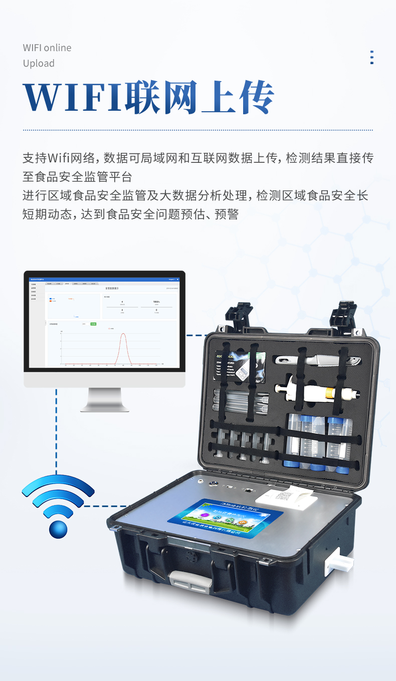 13、支持Wifi網(wǎng)絡(luò),數(shù)據(jù)可局域網(wǎng)和互聯(lián)網(wǎng)數(shù)據(jù)上傳,檢測結(jié)果直接傳至食品安全監(jiān)管平臺。進(jìn)行區(qū)域食品安全監(jiān)管及大數(shù)據(jù)分析處理,檢測區(qū)域食品安全長短期動態(tài),達(dá)到食品安全問題預(yù)估、預(yù)警