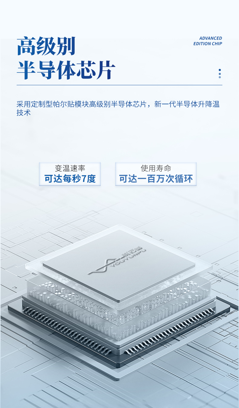 2、采用美國(guó)MARLOW定制型帕爾貼模塊高級(jí)別半導(dǎo)體芯片,新一代半導(dǎo)體升降溫技術(shù),最快變溫速率可達(dá)每秒7度,使用壽命可達(dá)一百萬(wàn)次循環(huán);