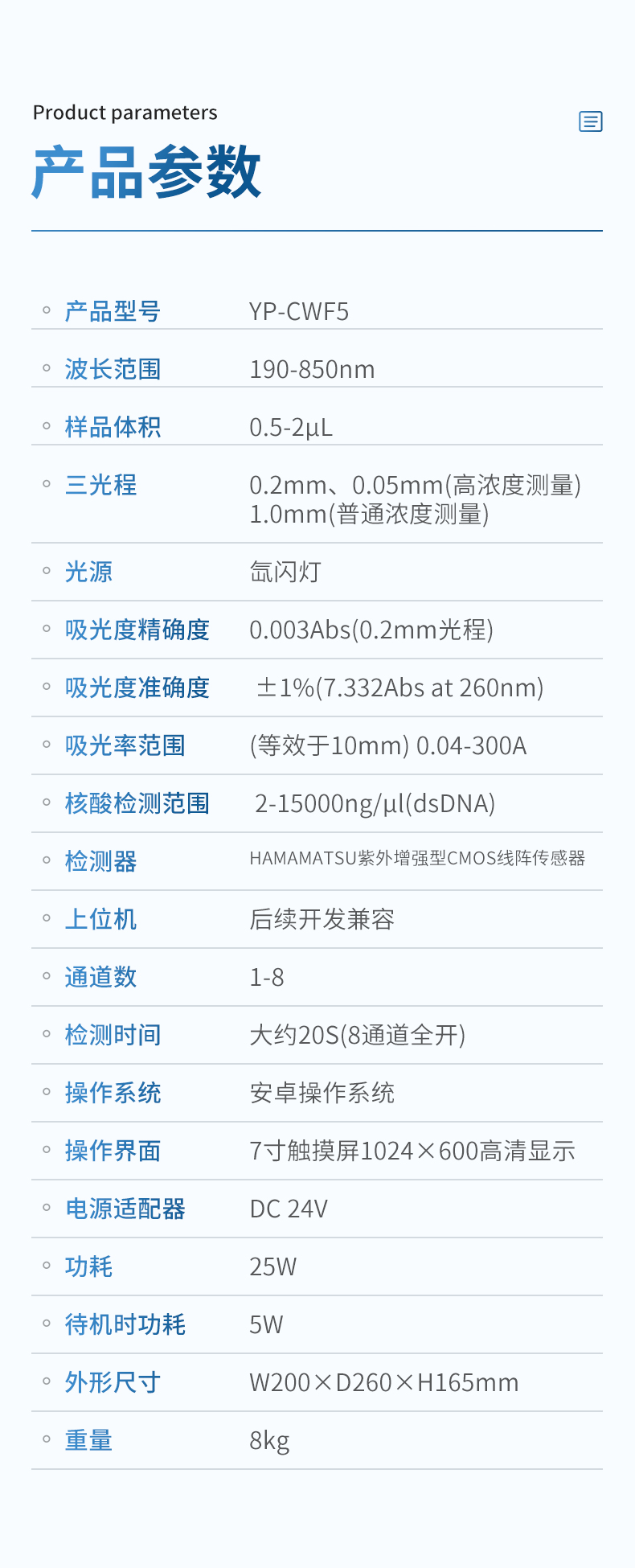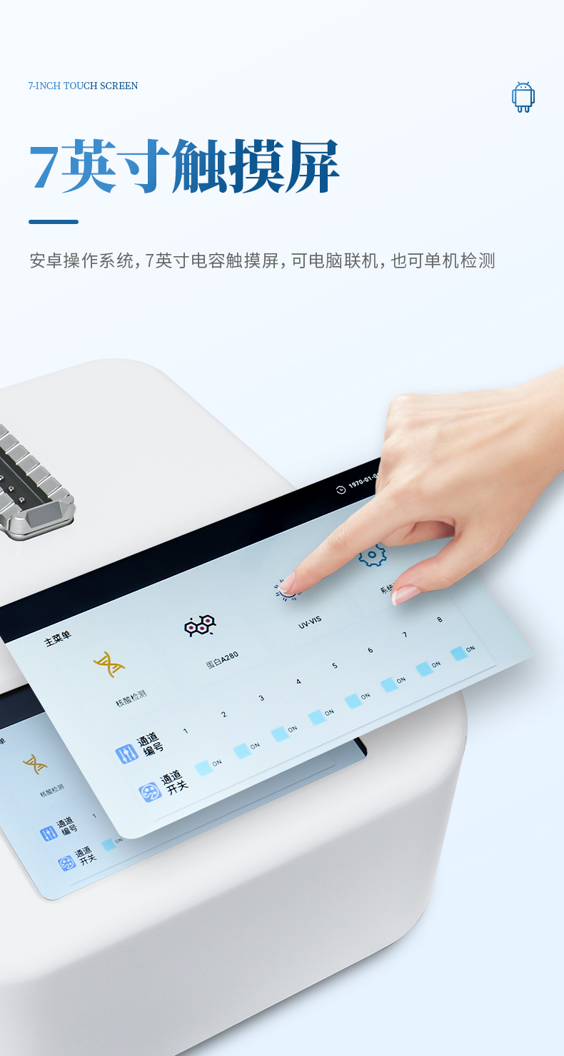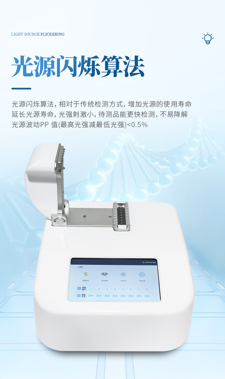超微量紫外可見分光光度計單機和PC 全部兼?zhèn)涞?-8可任意開啟的多通道全波 長(190-850NM) 微量分光光度計??煽焖贉蚀_的檢測核酸、蛋白質(zhì)和細胞溶液,核酸檢測每次測量  所需要的樣品量僅需1至2UL 即可。直接將樣品點于加樣臺上。無需比色杯或毛細管等附件。測量結(jié)束后,可以選擇直接將樣品擦去或者再用移液器回收樣品。所有步驟簡單快速, 一氣呵成。可應(yīng)用在臨床疾病診斷、輸血安全、法醫(yī)學鑒定、環(huán)境微生物檢測、食品安全檢測、分子生物學研究等多種領(lǐng)  域 。