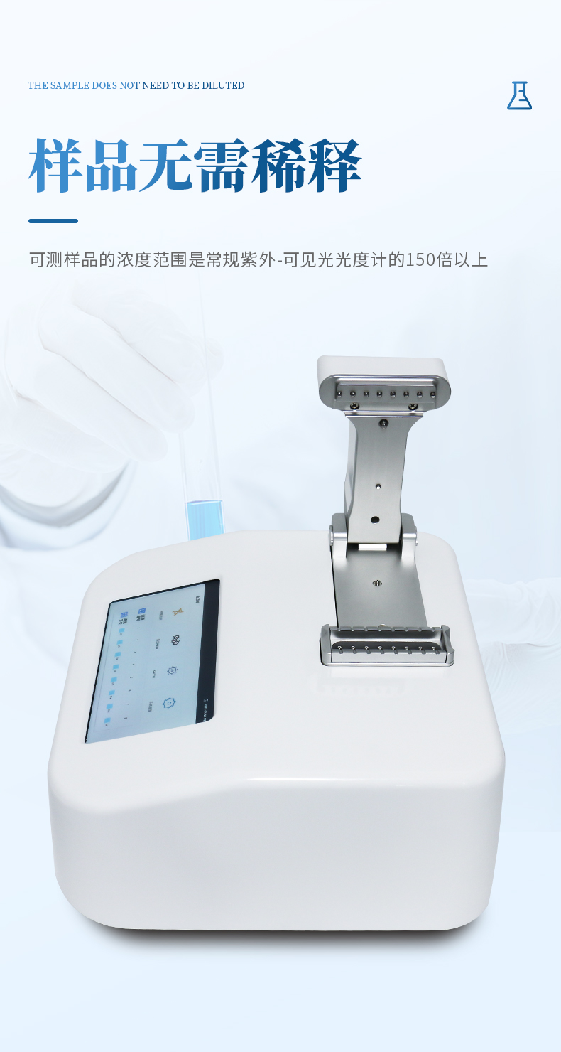 ●  樣品濃度:樣品無需稀釋,可測樣品的濃度范圍是常規(guī)紫外-可見光光度計的150倍以上;