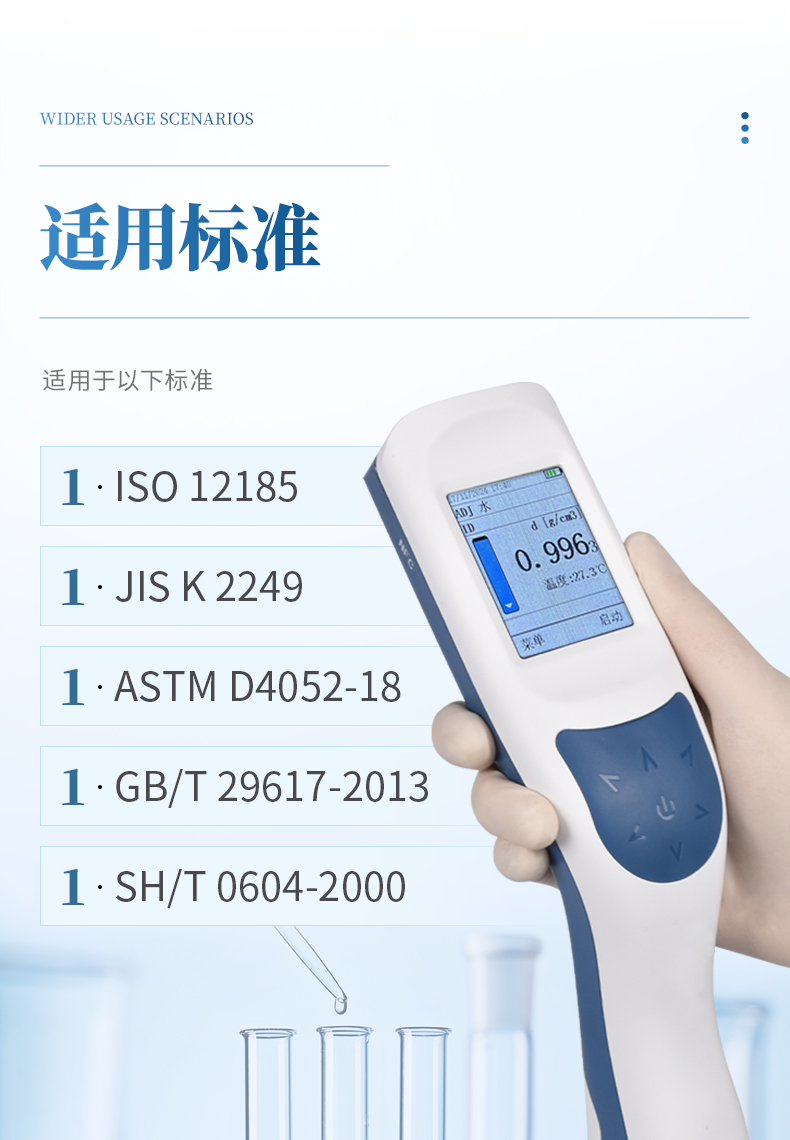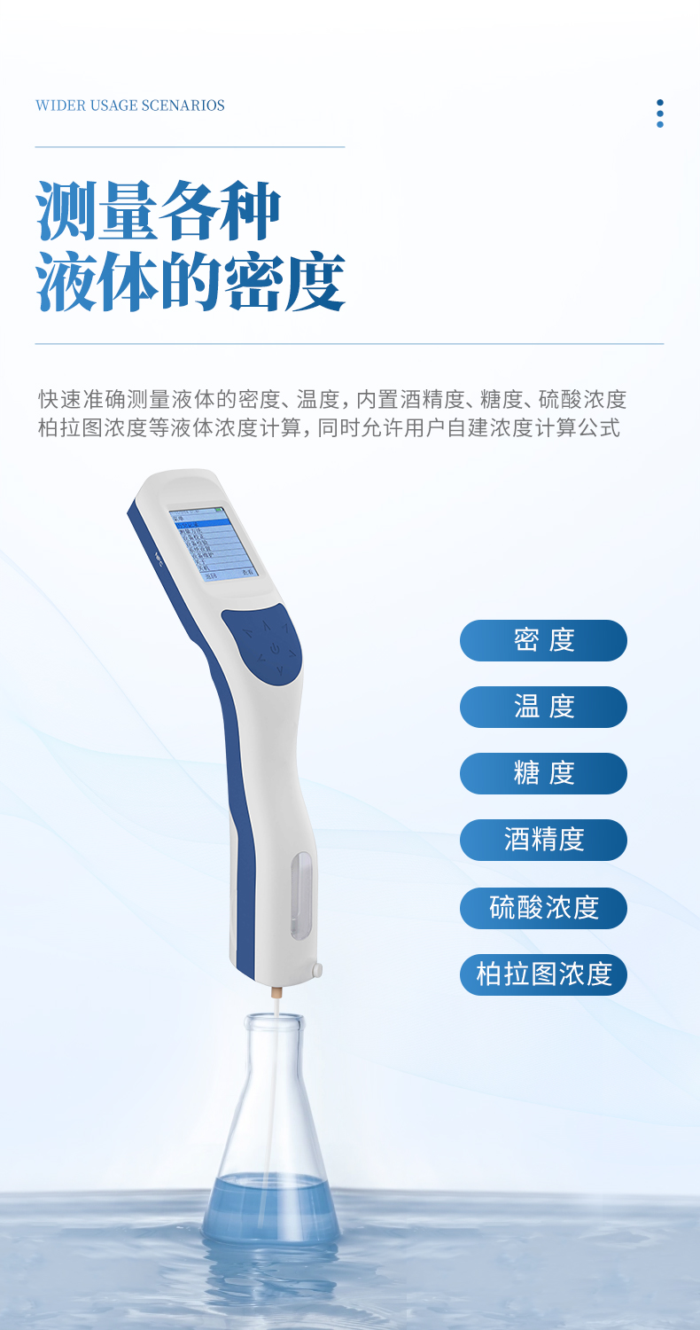 手持密度計是利用U型管振蕩原理,通過測量樣品的共振頻率來測定各種液體樣品的密度。它具有操作簡便、測量準確等特點,適用于各種液體的密度測量。
