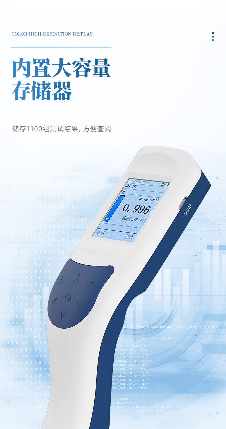 儀器采用2.4寸彩色高清顯示器,人體工程學(xué)握持結(jié)構(gòu),便于單手進行測量操作。內(nèi)置大容量存儲器,可以存儲千條以上歷史數(shù)據(jù),通過USB可以將數(shù)據(jù)導(dǎo)入U盤或者電腦,連接藍牙打印機可以立刻對測量結(jié)果進行無線打印。
